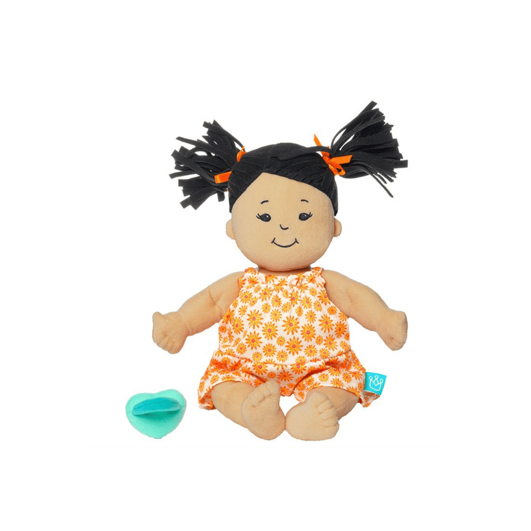 Baby Stella Doll, Light Beige Skin-tone with Black Pigtails - by The Manhattan Toy Company is the perfect first doll for your little one. Designed for 12 months and older, this soft and beautifully crafted baby has sweet, embroidered features. Baby Stella has a fun, floral outfit, and a pacifier that magnetically attaches to her mouth. Surface wash only. Recommended for ages 1 to 3 years old.
