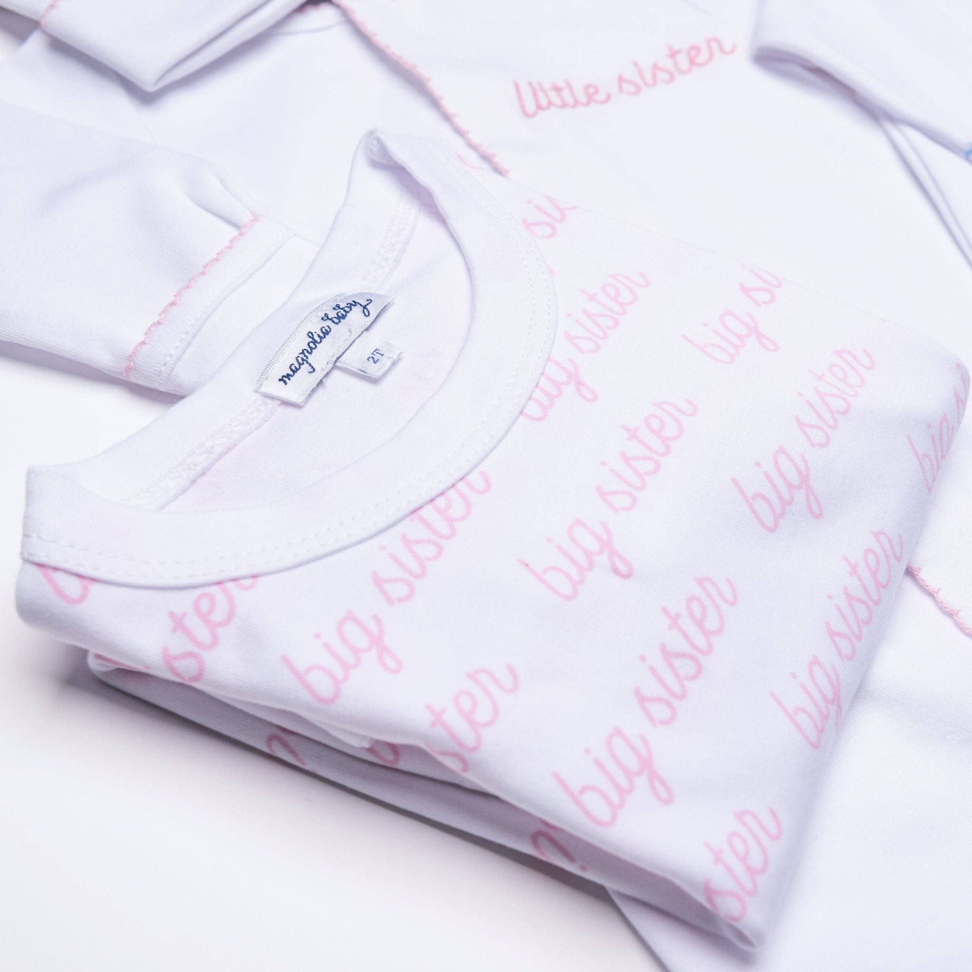 Celebrate the special bond between siblings with our Big Sister Print Long Pajamas! Crafted from luxurious Pima Cotton, these pajamas offer unparalleled softness and comfort for your little one. The design features an all-over "big sister" print in a gentle pink, highlighting her special role.