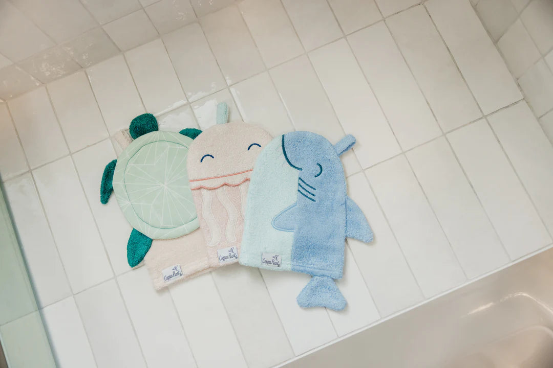 The cutest way to clean up.Made of super-soft bamboo terry cloth. Featuring loops to hang dry, the mitts have a universal fit for any-size hand.