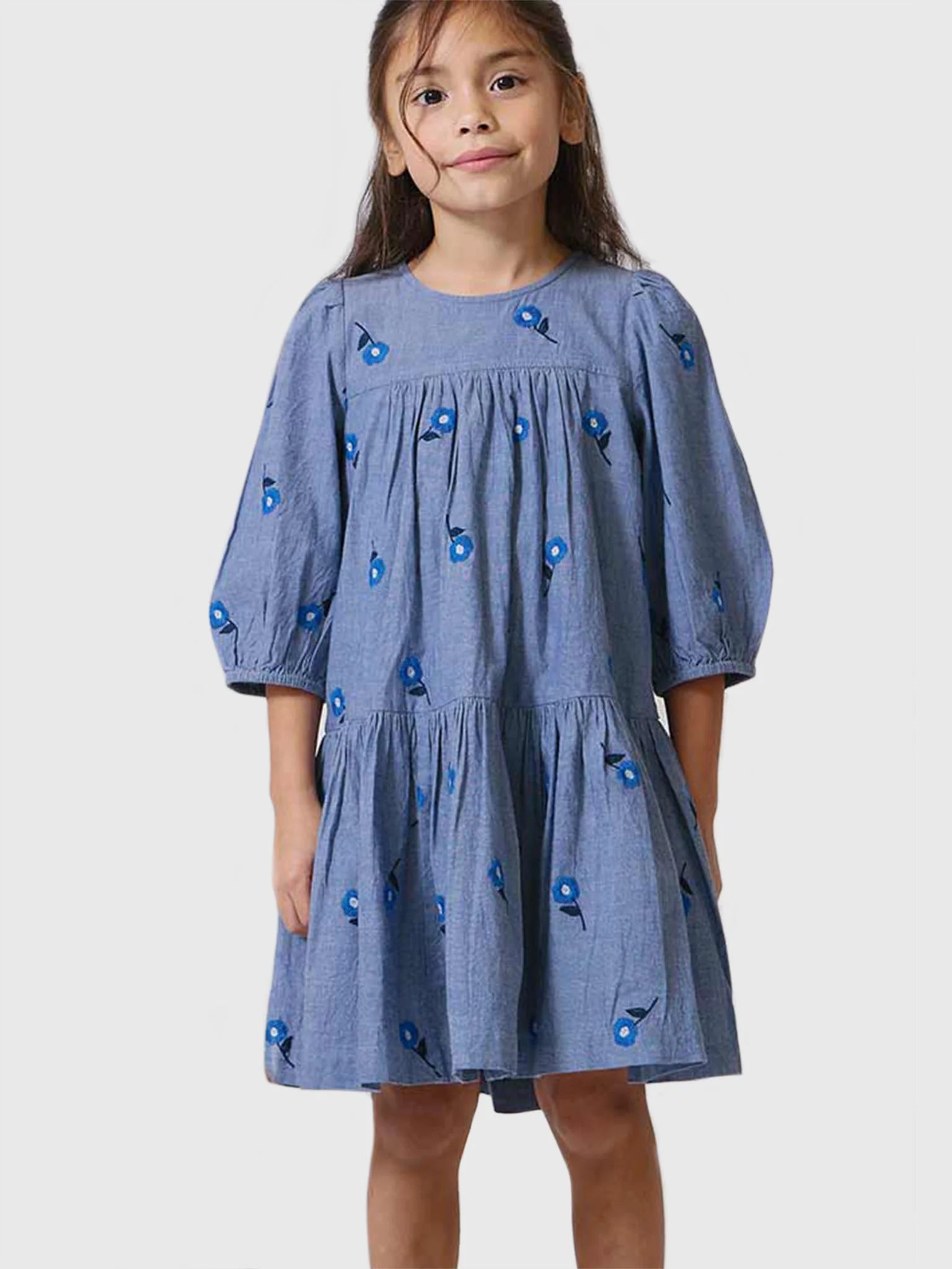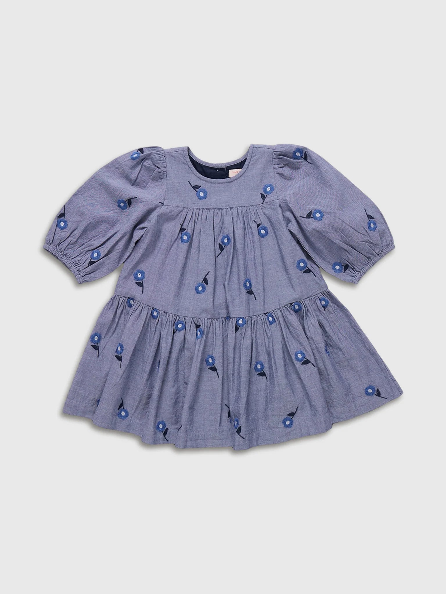 Delicate Flowers! A scattering of sweet daisies bloom from a classic chambray ground in our Blue Blossom Embroidery shown here on our Girls Fiona Dress. Design highlights include elastic puff sleeve, and silver glitter buttons at the back. Pair super swingy silhouette with a bobby sock and a mary jane show for an classically elevated look.