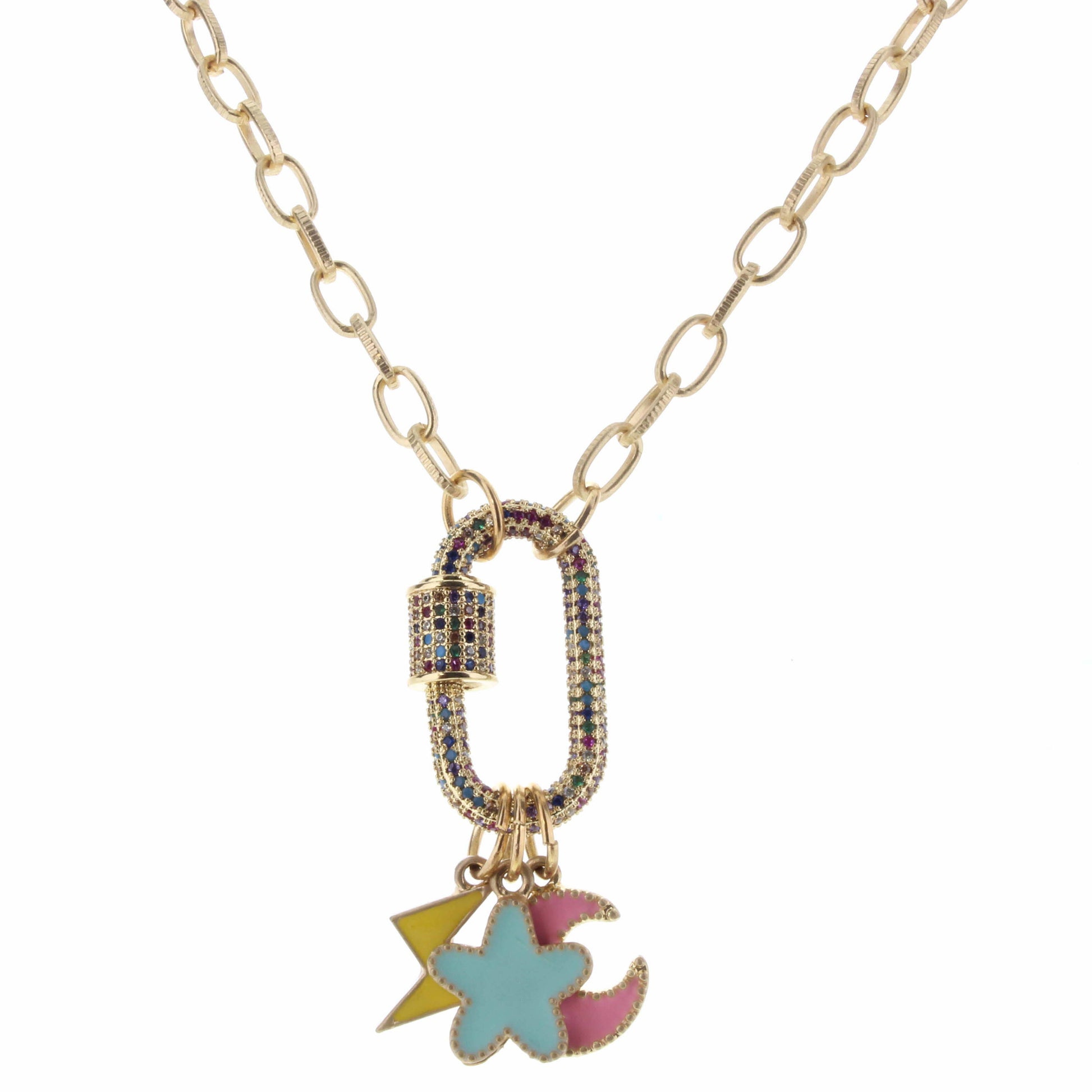 Multi Crystal Oval Carabiner with Charms Necklace 14"
