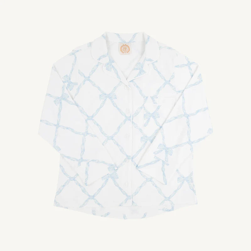 Indulge in luxury with our Let Me Lounge Top in exquisite Buckhead Blue with a delicate Belle Meade bow in Worth Avenue White. From The Beaufort Bonnet Company, this top is perfect for cozy pajama nights and even matches our newborn gown for a picture-perfect hospital look.