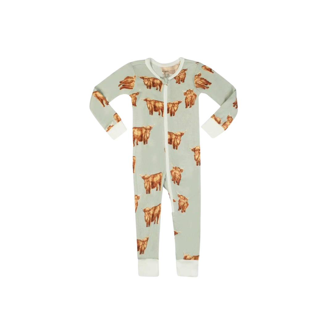 Our extra soft bamboo Zipper Pajama in the Highland Cow print blurs the lines between sleepy time, playtime, and cuddle time.