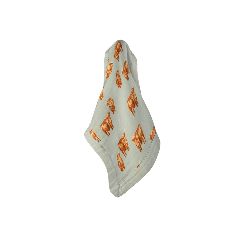 From security and comfort to reassurance and love, we understand the significance a Mini Lovey Security Blanket plays in our little one’s world. Our Mini Lovey Security Blanket in the Highland Cow print has mitered corner binding, measures 18” by 18”.