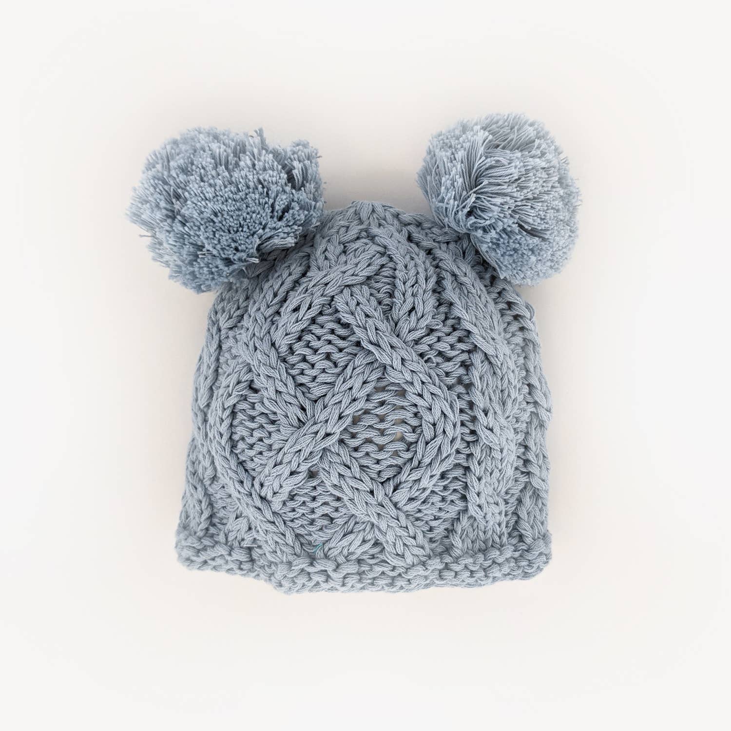 This fun double pom pom hat in knit in an aran cable design is shown here in chambray, a sophisticated muted blue. It is a great hospital hat for coming home, perfect for first portraits and makes a great baby shower or hospital gift. Sized just for newborns, it has a roll-up brim for a slight adjustment in head size.