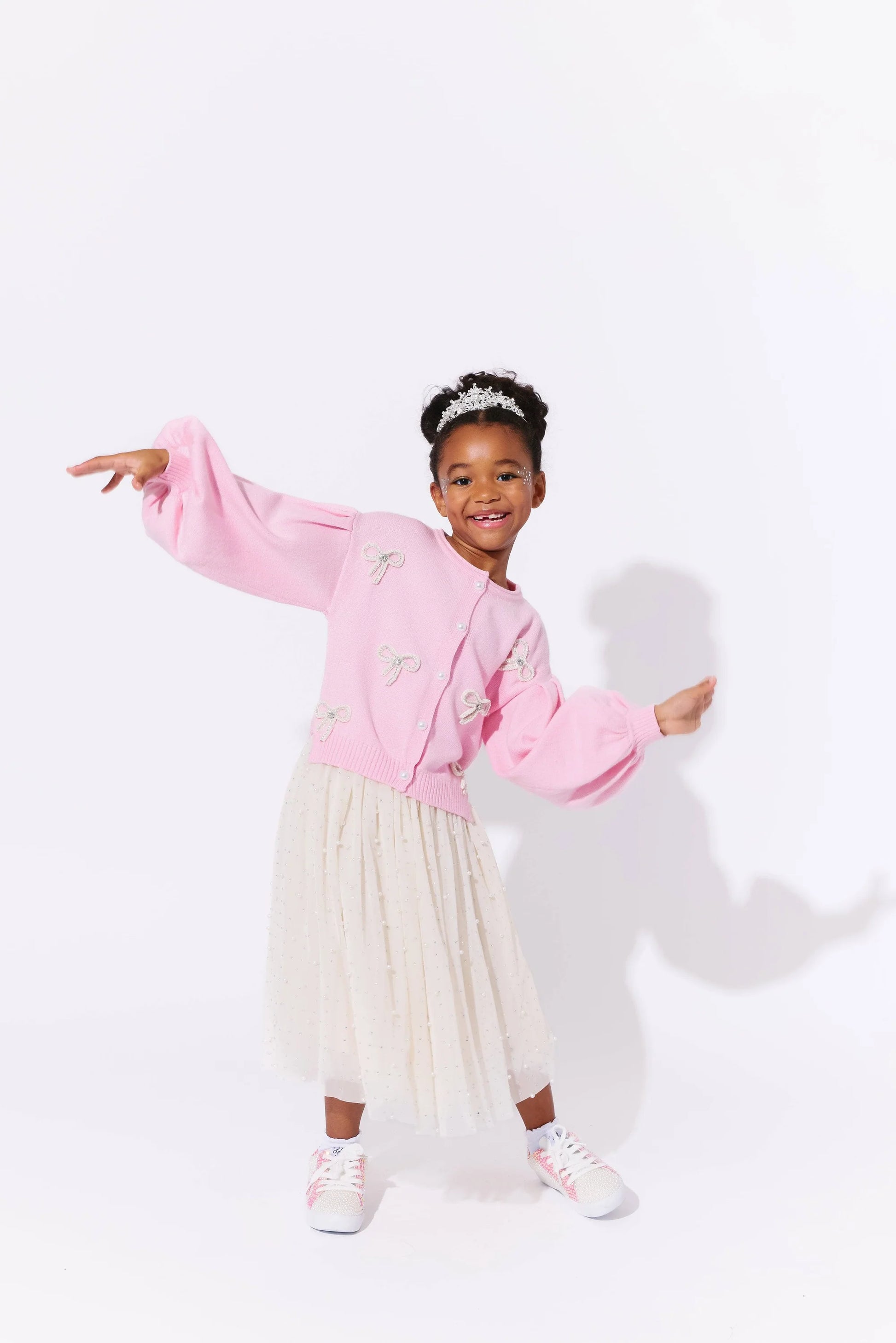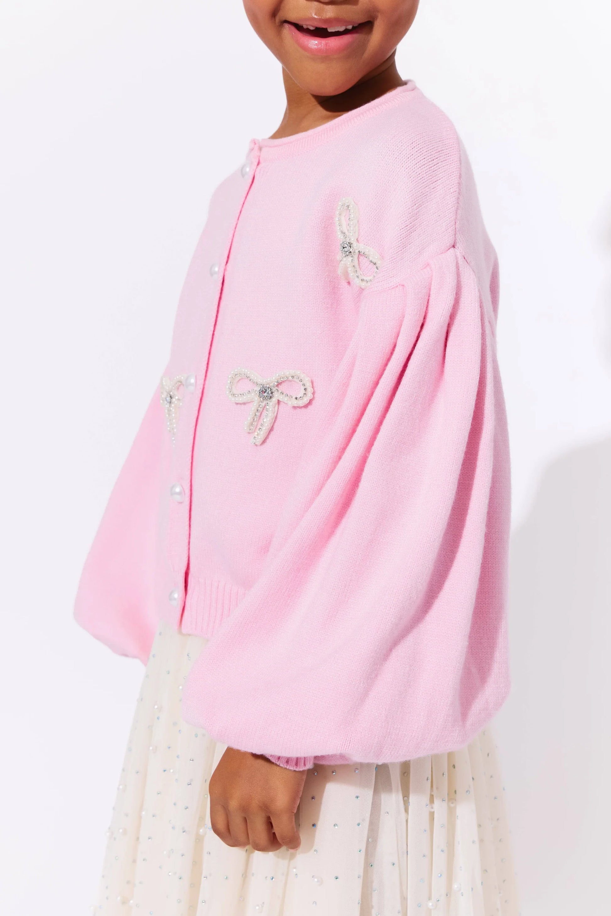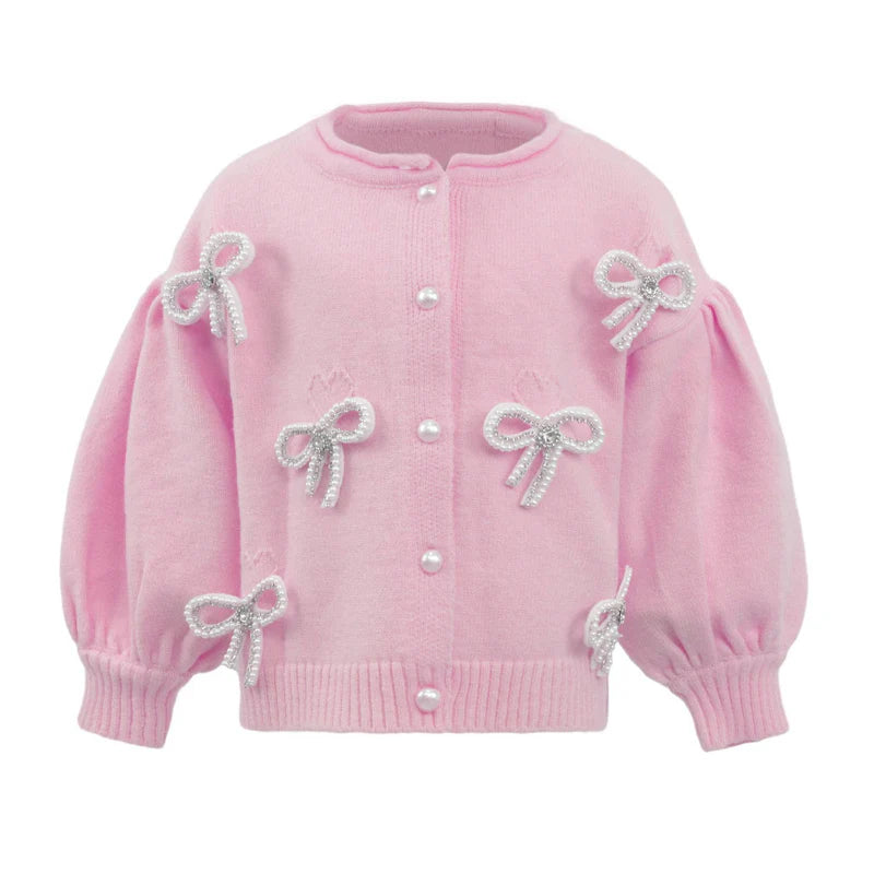 - Soft pink cardigan embellished with delicate pearl bow appliqués for a charming and feminine look.