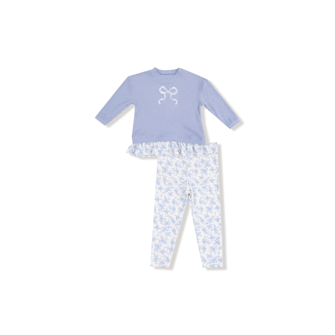 Get ready for cozy playdays with this adorable set featuring an Angel Dear waffle pullover topped with a charming ruffle and ribbed bow applique. Paired with soft ribbed leggings in a vibrant Romi floral print, this outfit blends comfort and style perfectly for your little one’s everyday adventures.