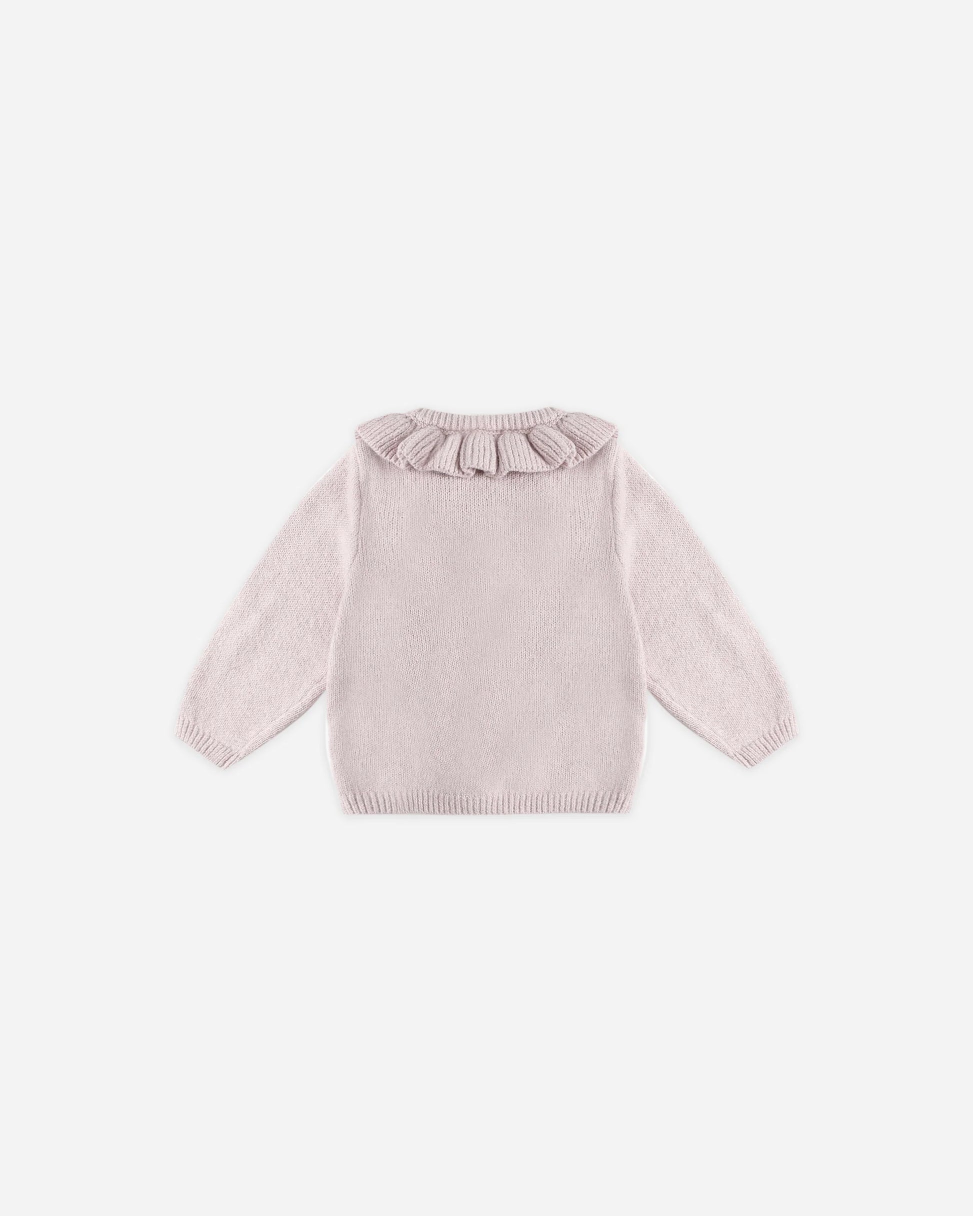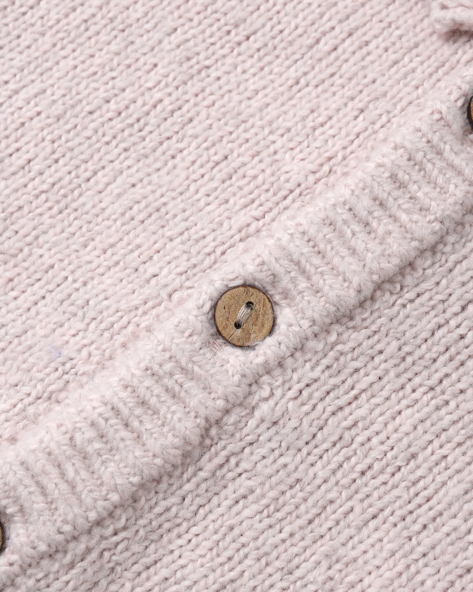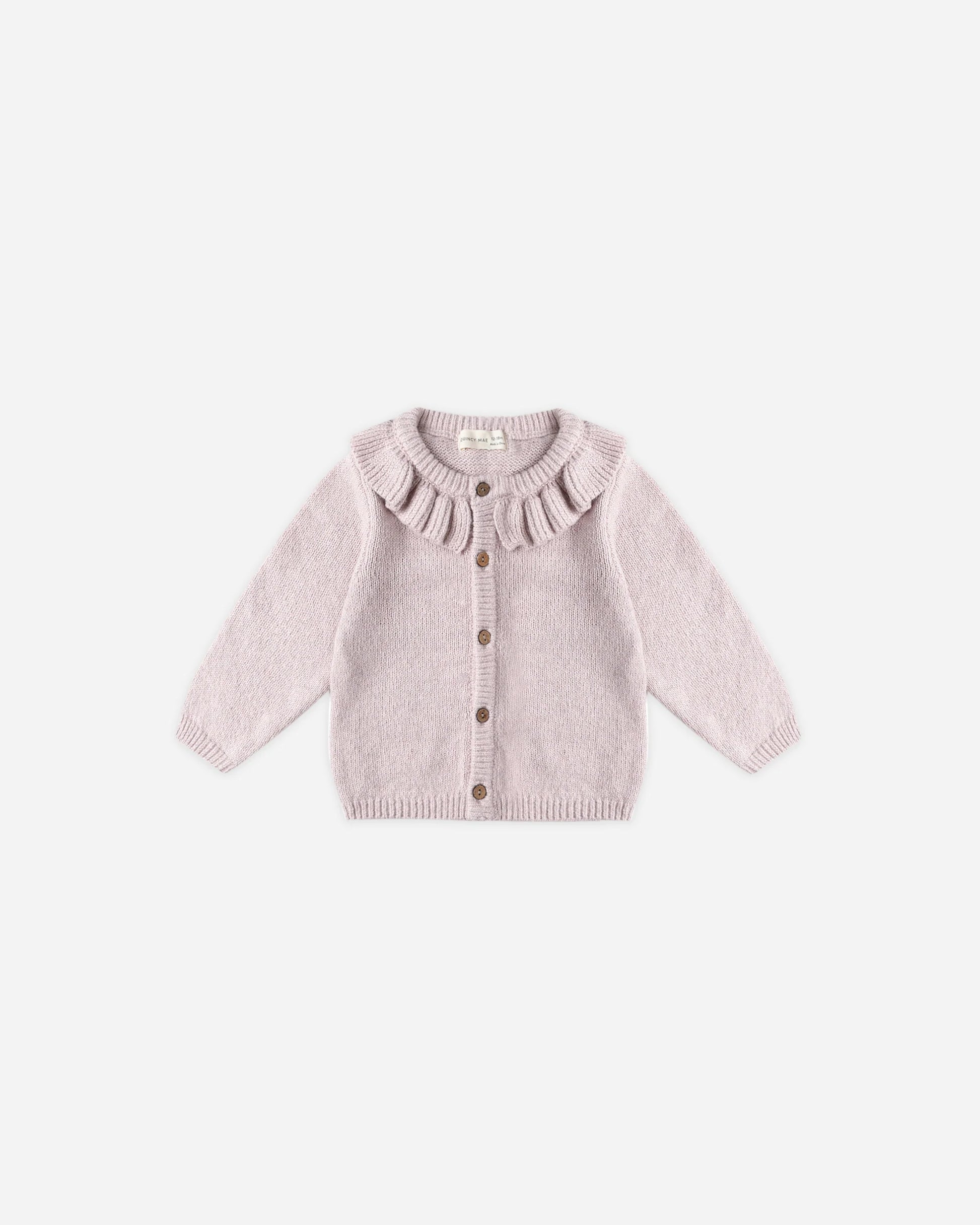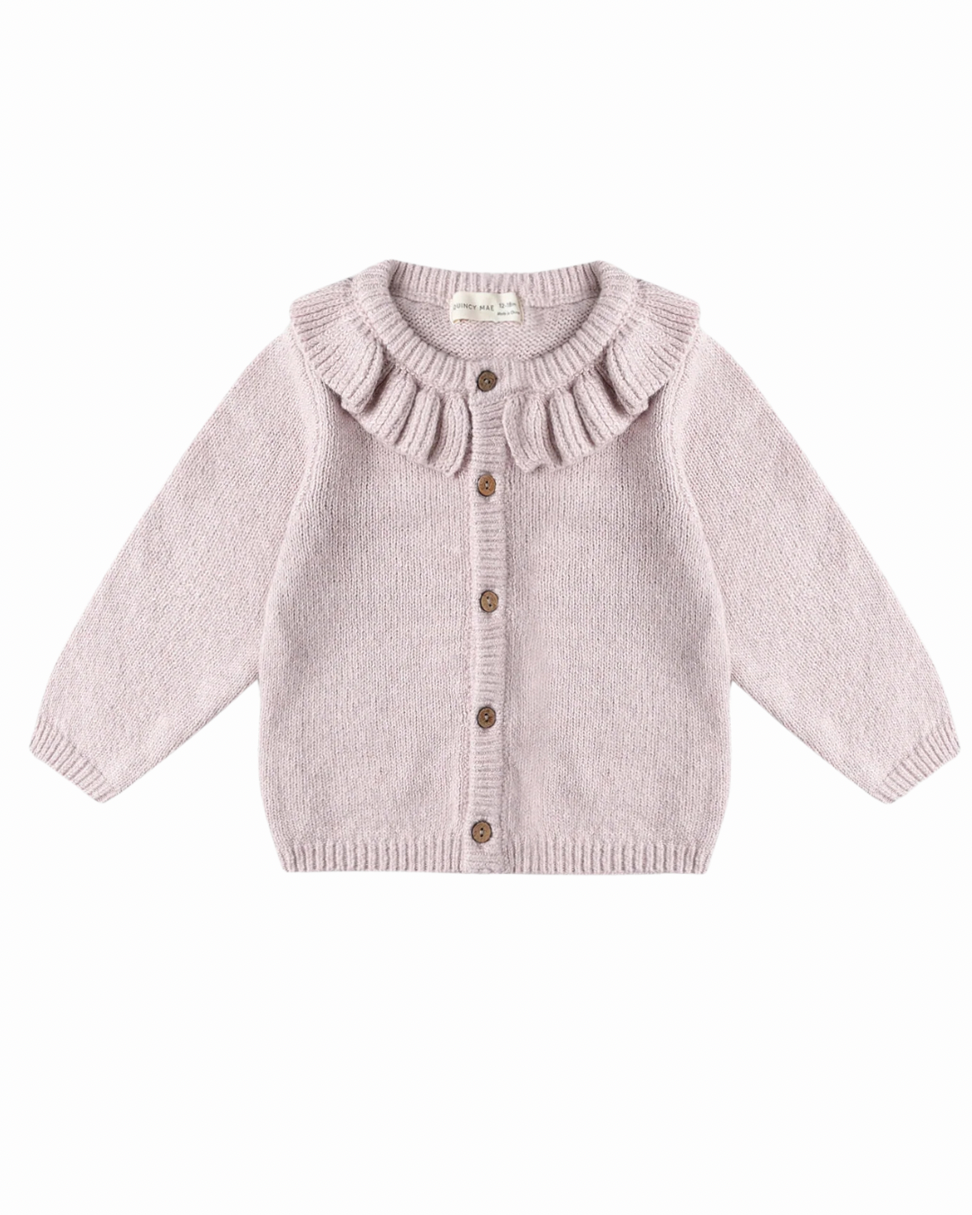 This sweet cardigan features a charming ruffle collar and coconut buttons, making it perfect for layering on fall and winter days.