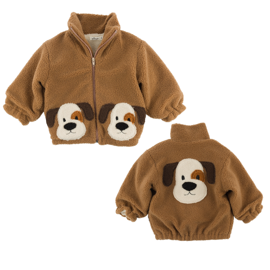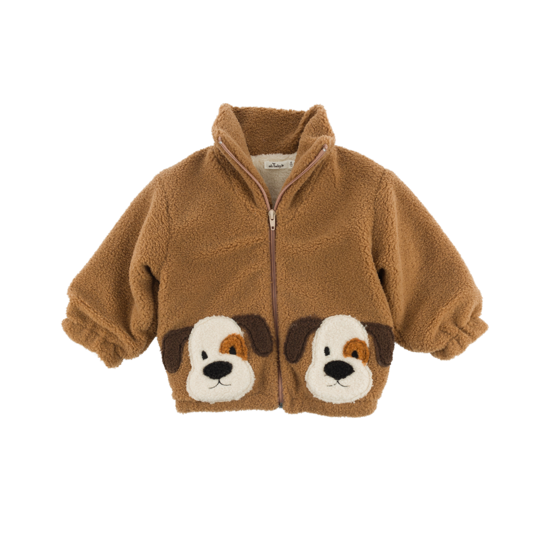 Sherpa faux fur jacket with a plush, soft fleece lining. Featuring appliqué puppy faces.